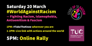 20 March 2021 is UN Anti-Racism Day, organised by Stand Up To Racism and the TUC. Events will take place this Saturday in cities, communities, and online where people from around the world will come together united against racism, antisemitism, anti-Roma racism, Islamophobia, Sinophobia, and fascism. Participants also stand in solidarity with refugees and migrants, letting those in power know that fanning the flames of racism to distract from failings of the Government will not be tolerated.